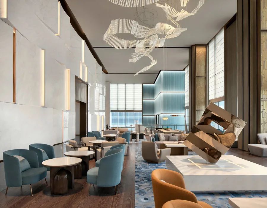 香檳金色的立體幾何雕塑占據(jù)大堂視覺焦點(diǎn),該藝術(shù)品由抽象的“集裝箱”拼接而成的回形正方體,寓意方正,平等,均衡,讓空間更為精致大氣。