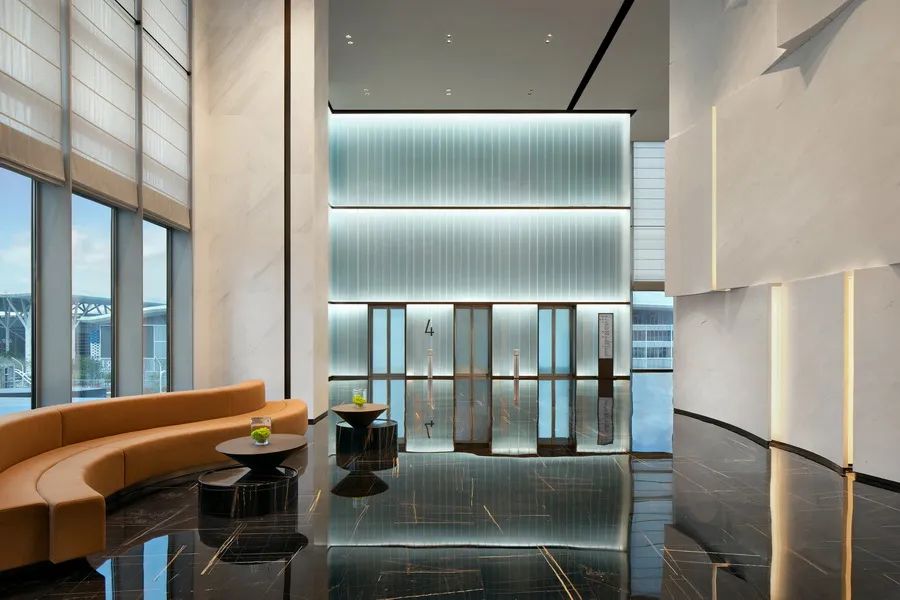 大堂更強(qiáng)調(diào)空間的功能性,為多人同時(shí)辦理入住提供條件,核心弧形墻面的設(shè)計(jì)取義“帆船”,層疊的造型又似集裝箱堆砌,增添空間的趣味性與藝術(shù)感,也表達(dá)了聚集的喜悅與對每一次揚(yáng)帆起航的期待。公共電梯延續(xù)了帆船的心態(tài),搭配金屬收邊,更具質(zhì)感。