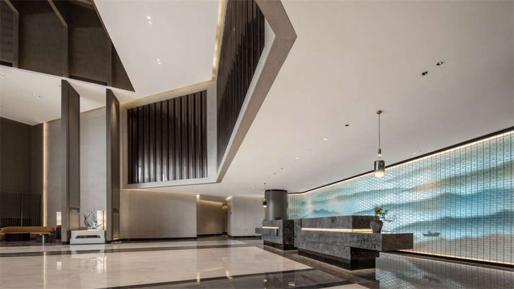 落客區是一個酒店的初識。在簡約現代的建筑入口,疊泉層層延展并與蓄水池融洽無間,細節之上表達著循環往復、生機無限的意味。水幕墻涓涓之流打造出的朦朧感,營造著溫聲細語的視覺輕柔,是入口賞心悅目的焦點,是“歸家”前語淺情深的儀式。