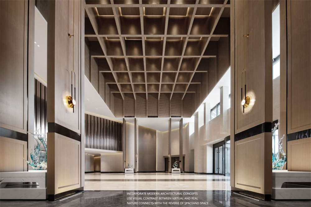 酒店大堂將木質結構融入現代建筑理念之中,尤其頂部的設計更是別有洞天。屋頂采用中式傳統藻井結構——層層疊木與榫卯形態結合,通透格柵與暗藏燈帶搭配,明暗凸顯,以視覺上的虛實比擬深邃蒼穹、以不失柔和的秩序完成自然與空間的遐想銜接。