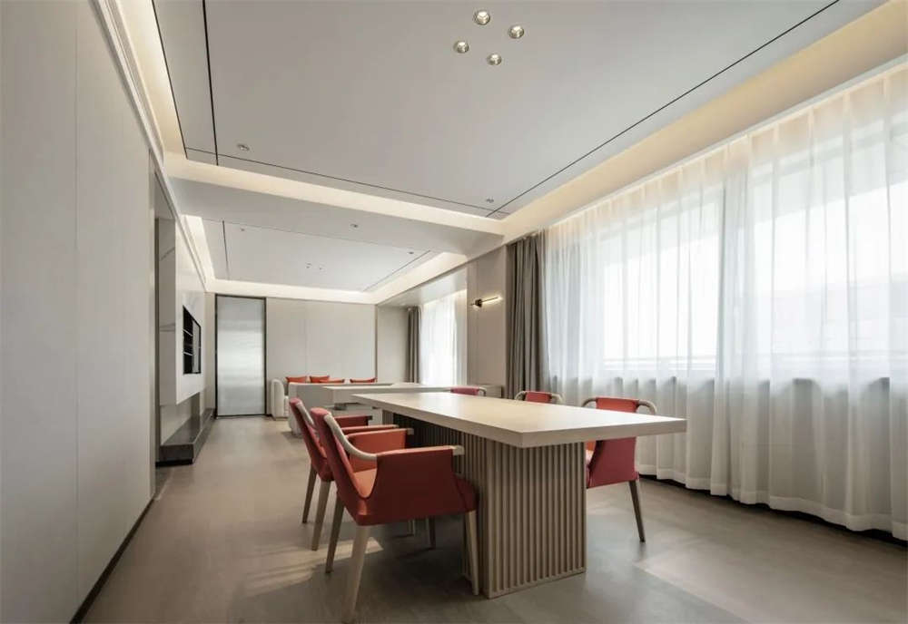 會議室,墻壁設計借鑒屏風造型,暗藏燈帶打破墻體的沉悶感,以分明的層次增添了簡約時代氣息。朱柿紅的旋轉座椅,呼應出具有科技感的視覺韻律。靛藍祥云地毯紋樣的流線造型,為會議室的嚴肅氛圍平添了輕松舒心的視覺色彩。