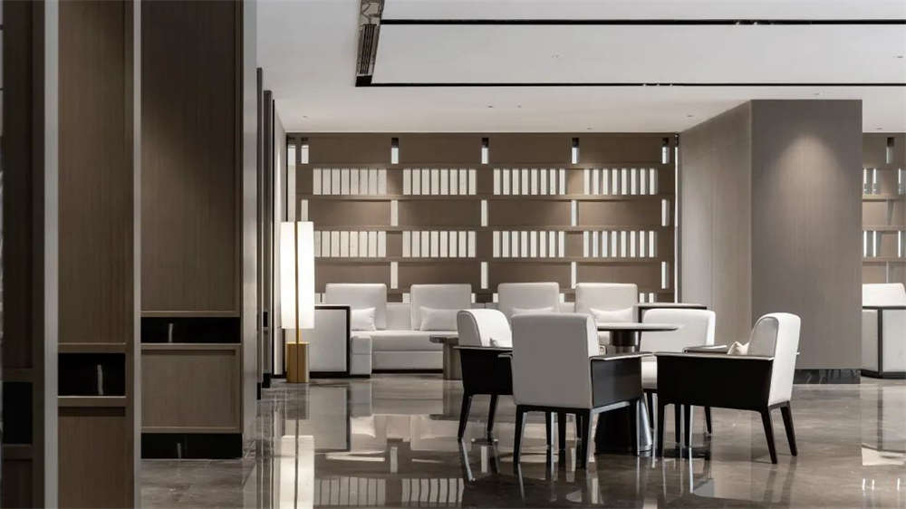 二層前臺背景是以屏風造型演化的雙色分割圖,羅漢松將大堂吧的院落感延續至此,格狀分割架的氛圍燈與墻壁暗藏燈光帶,共同營造出新中式的靜雅之感。