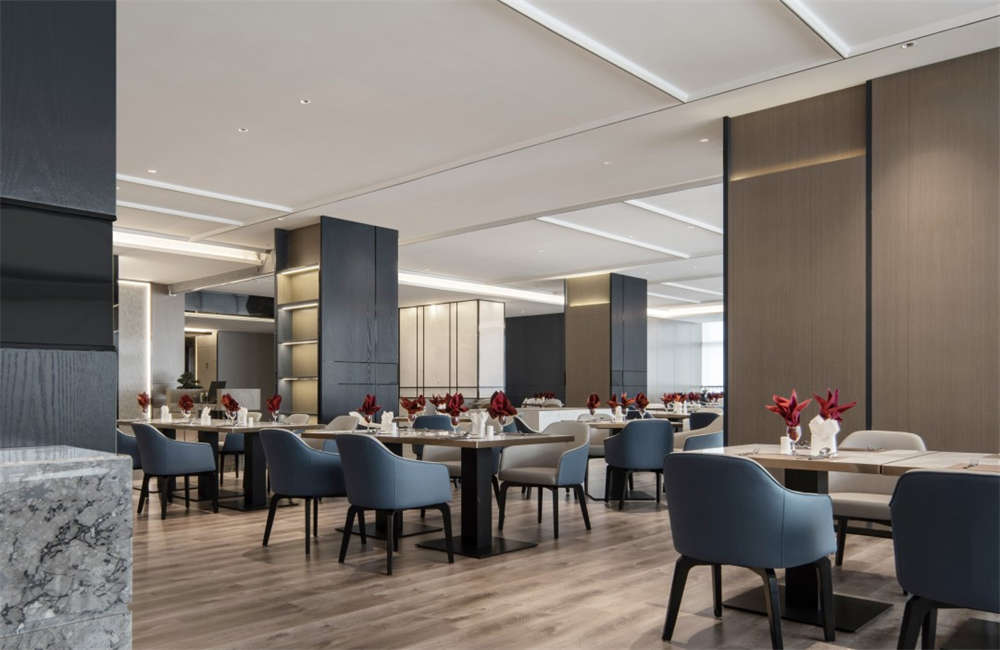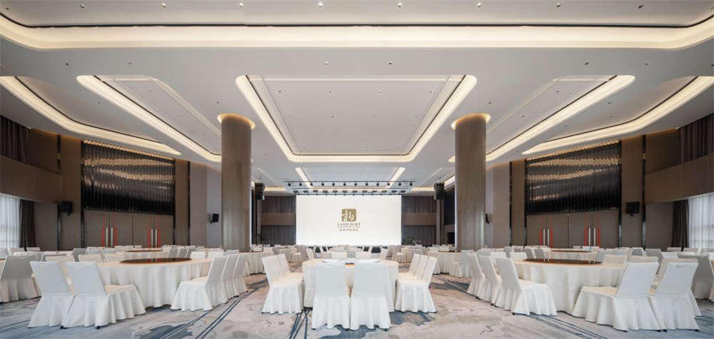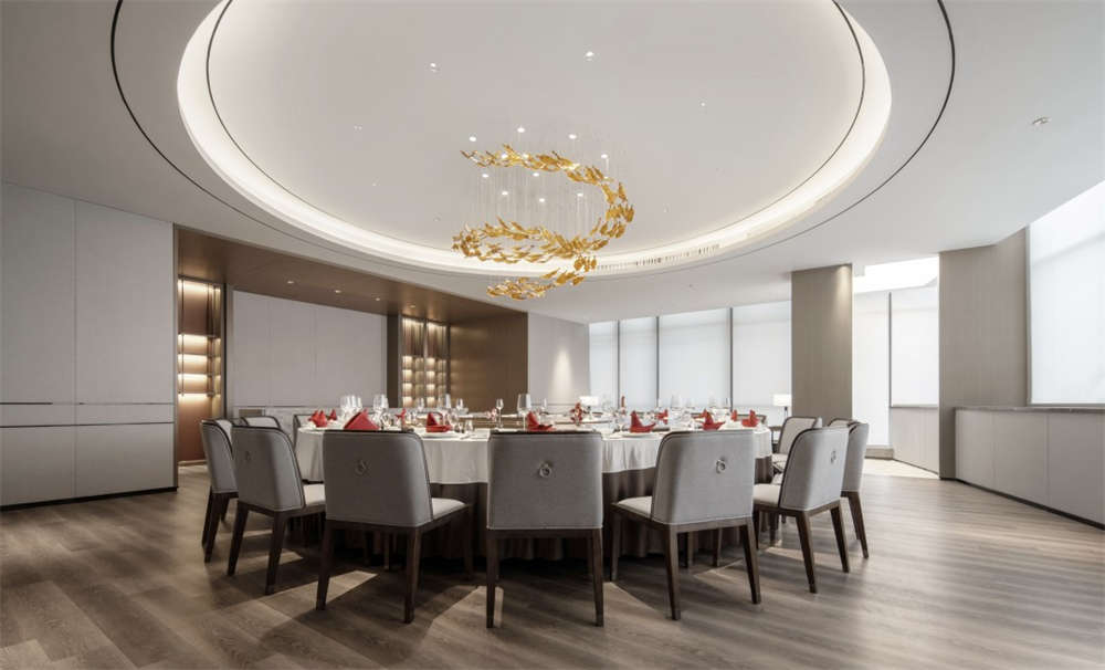 多功能廳,以白色餐桌與云紋花卉地毯,打造出舒適空間的靜謐質感,結合頂部燈帶,為大廳增添莊重氛圍。廳內屏風造型的隱藏柜格可在需要之時,將整個大廳分割成三個區域。