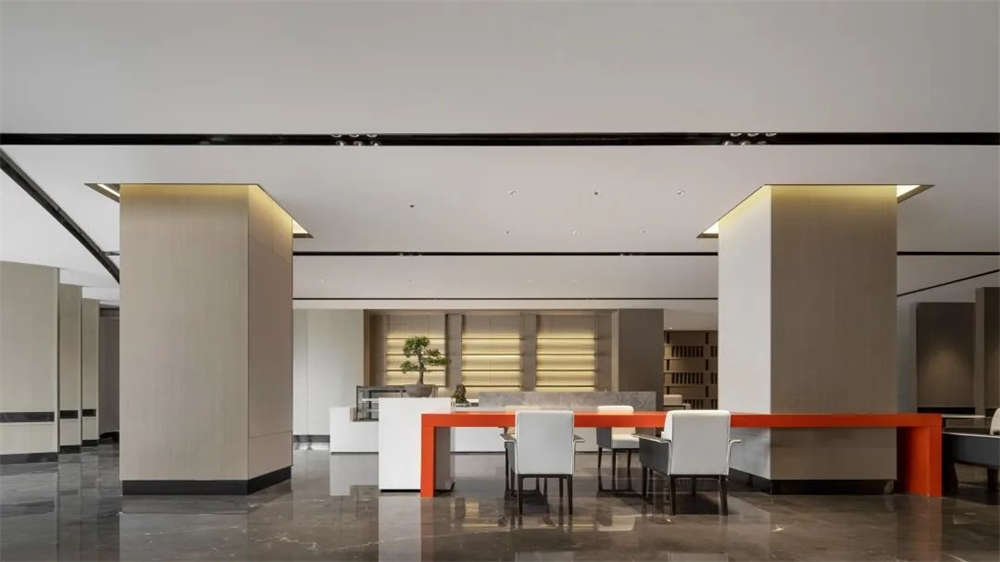獨有的商務功能詮釋著商業時代的特征,木制桌臺與朱柿紅座椅搭配,打造出松弛、舒適的多功能商務辦公空間。